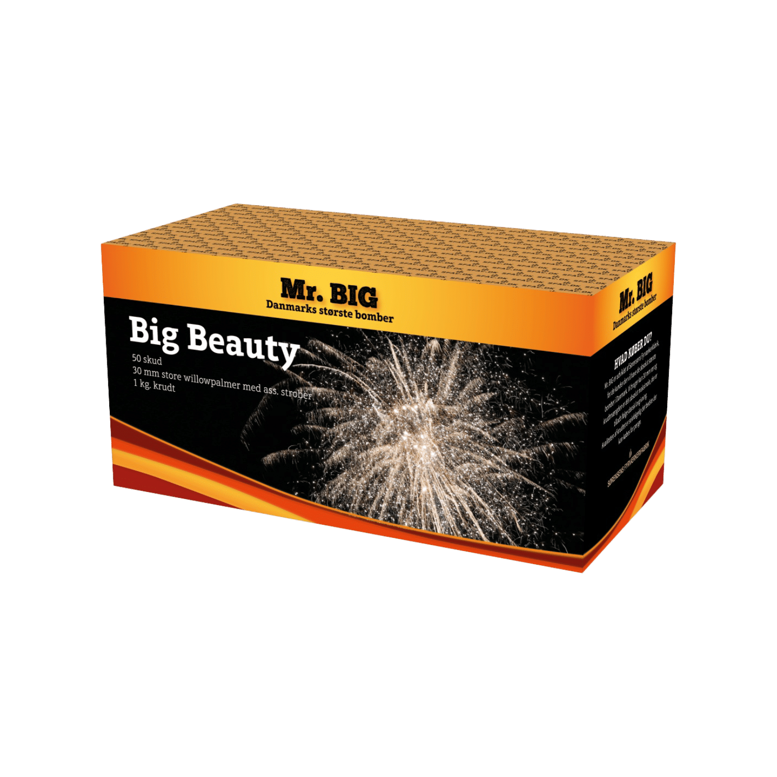 50 kraftfulde skud i 30 mm kaliber og fyldt med 1 kg krudt! Batteriet leverer enorme willowpalmer med assorterede strober, der lyser himlen op med professionel kraft. Elsker du store skud og tungt fyrværkeri? Så er Mr. Big-serien lige noget for dig – det største kaliber, du må skyde med i Danmark!