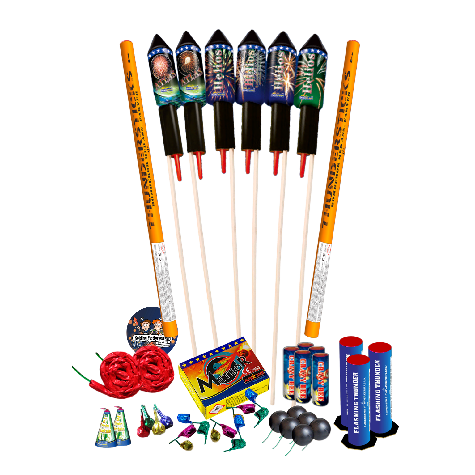 Sortiment med små og større effekter – inkl. raketter og bomberør. Et billigt og populært udvalg fra Sørensens Fyrværkeri.
