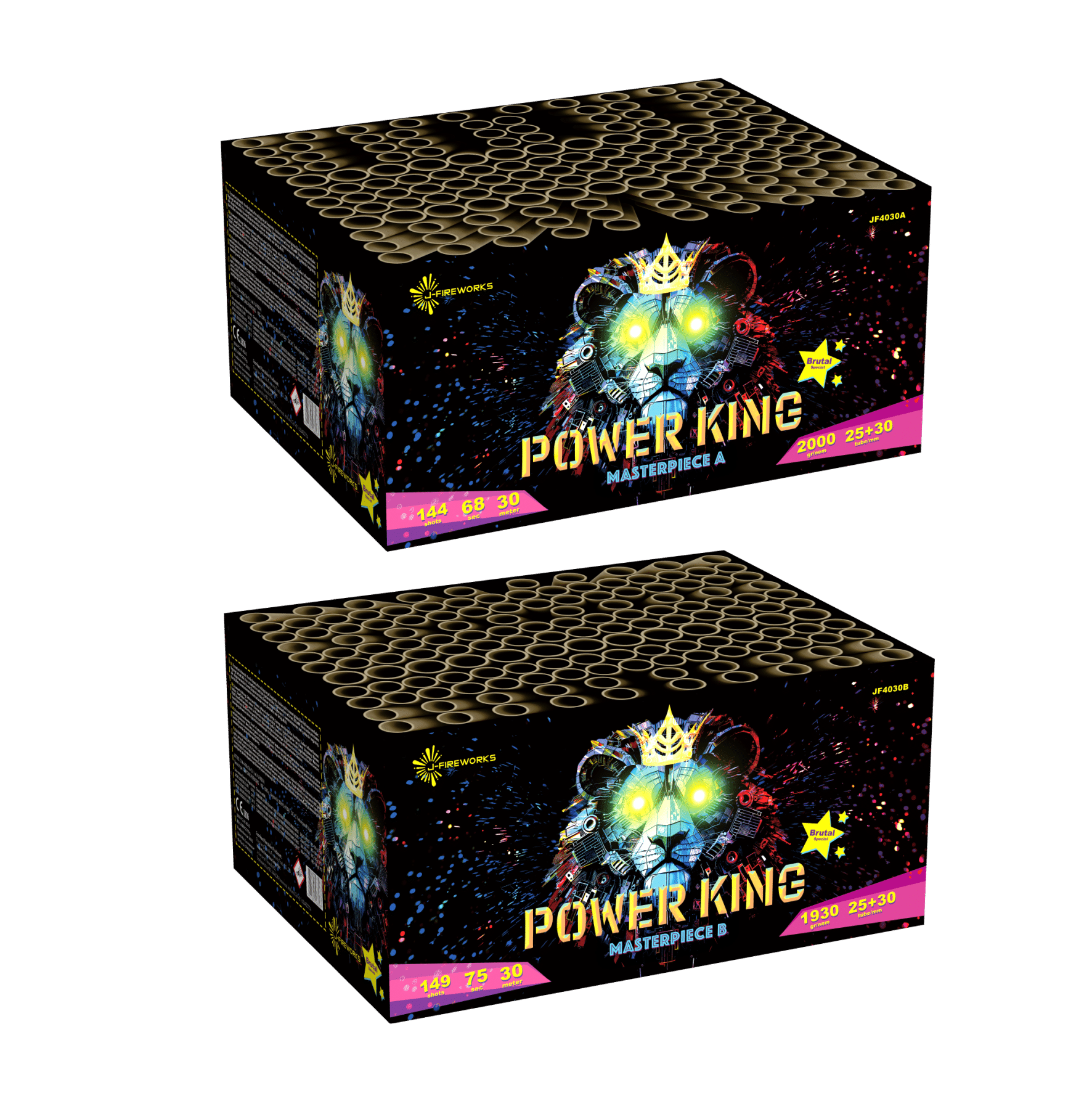 Navnet siger det hele – her taler vi kongen af krudt! Power King viser sin styrke med 25 og 30 mm kalibre, hvor 30 mm er det største man må skyde af i Danmark. Med næsten 4 kilo krudt tager den magten over nattehimlen og viser, hvem der bestemmer! Når du hører første brag, kan du lige så godt poppe champagnen – for nu starter årets største fest! Power King leverer et kongeligt show med vilde farver, kæmpe effekter og masser af attitude. Et produkt fra J Fireworks, udvalgt og forhandlet af Kolding Festfyrværkeri – hvor kongerne af nytåret holder til!